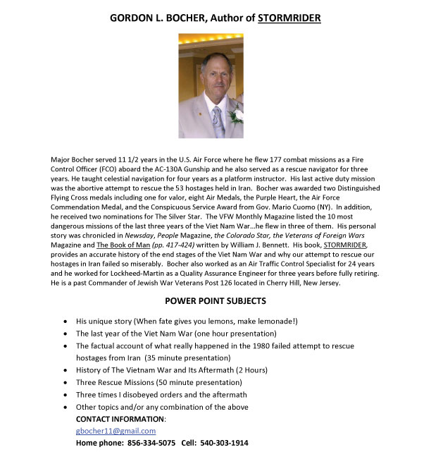 Gordon L. Bocher served 11 1/2 years in the Air Force. He flew over 170 combat sorties as a Fire Control Officer (FCO) aboard the AC-130A Gunship. As a rescue navigator, Mr. Bocher participated in the abortive attempt to rescue the 53 hostages held in Iran. Throughout his service, Mr. Bocher was awarded two Distinguished Flying Cross medals, eight Air Medals, The Purple Heart, The Conspicuous Service Award from Gov. Mario Cuomo (NY) and two nominations for The Silver Star.